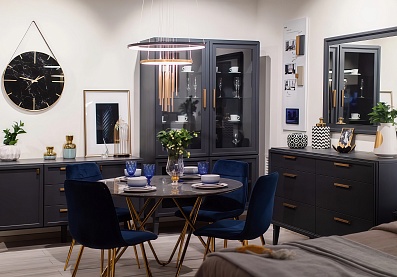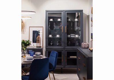 - В нижней части за распашной стеклянной дверцей одно отделение со шпонированной внутренней полкой, в верхней части за распашной стеклянной дверцей отделение с тремя стеклянными полками;