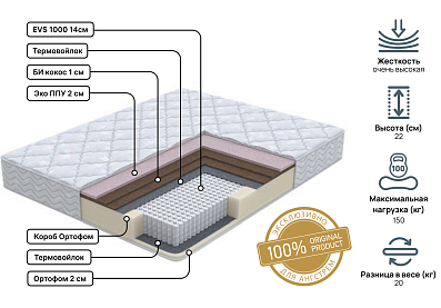 Односторонний матрас очень высокой жесткости. В основе матраса - интеллектуальный блок независимых пружин 1000 пружин на спальное место. В сочетании с двойным слоем Би кокоса и слоем Эко ППУ обеспечат надежную поддержку вашего позвоночника. В основе матраса опорный слой Ортофом, позволяющий равномерно распределить нагрузку. Чехол матраса выполнен из трикотажной ткани, простеганный на дополнительном слое Ортофом.