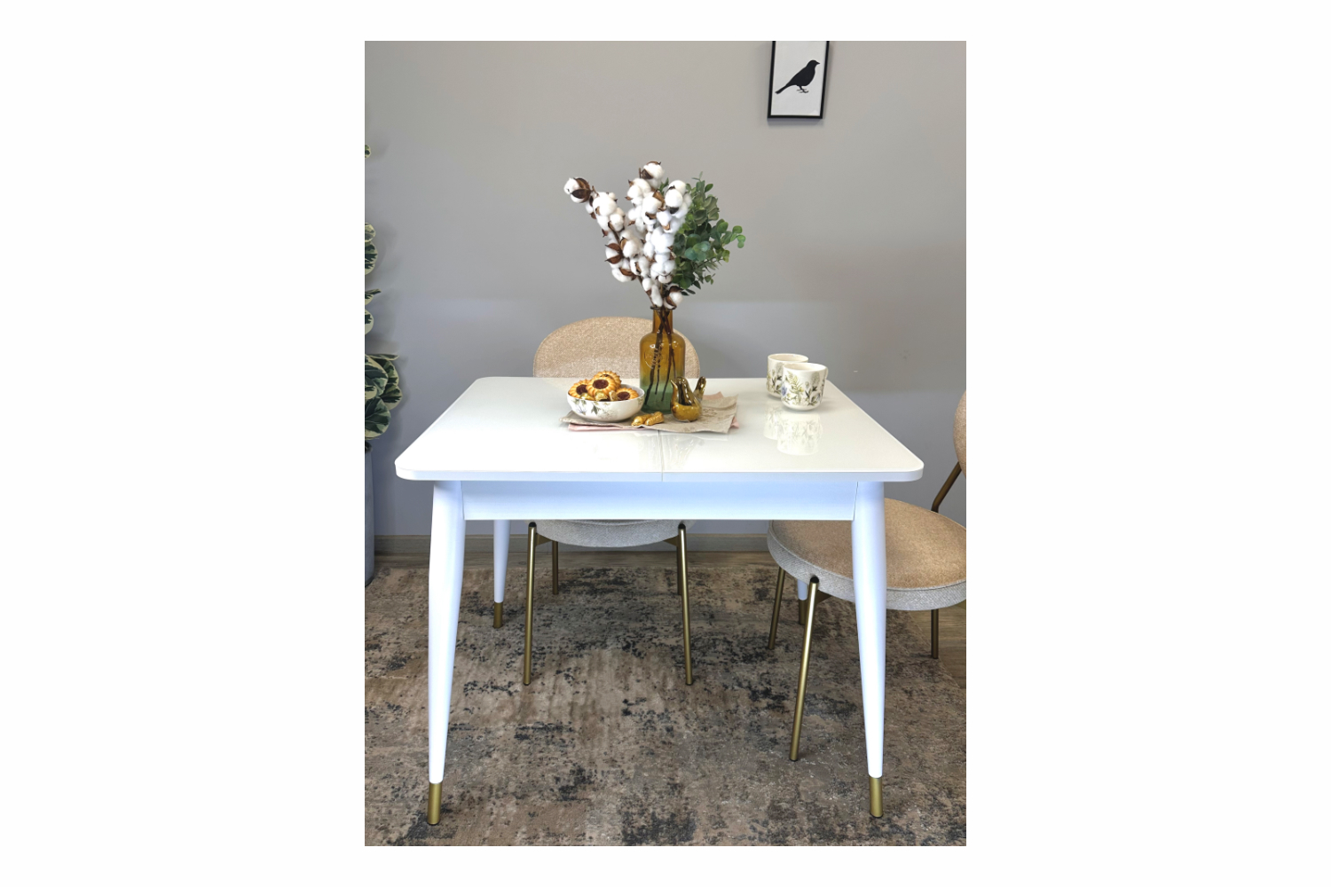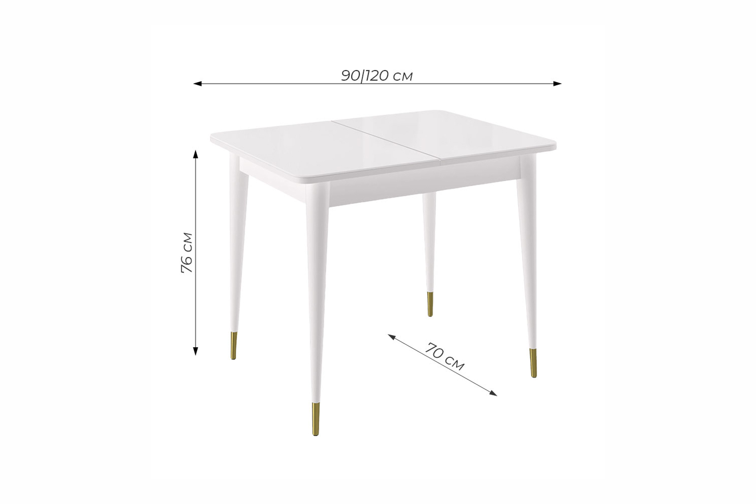 Стол обеденный Мане прямоугольный раздвижной К1100 опоры белого цвета с металлическими наконечниками, столешница - стекло белый глянец.