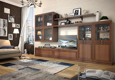 Модульная система позволит регулярно менять внешний вид гостиной по своему усмотрению. В комплект входит два навесных шкафа-витрины, напольные шкафы с застекленными вставками и глухими нижними фасадами, настенные полки и вместительная ТВ-тумба.