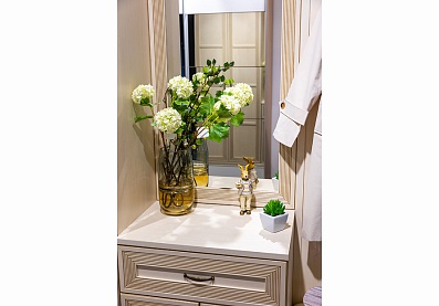 Сдержанная роскошь проявляется в деталях: элегантные латунные ручки, фрезерованные филенки, изящные витые менсолодержатели. Ручное патинирование придает фасадам налет старины, качественное лаковое покрытие устойчиво к выцветанию, не желтеет со временем. Надежная, продуманная фурнитура — петли с доводчиками, накладные демпферы, скрытые направляющие — превращает эксплуатацию гарнитура в истинное удовольствие.