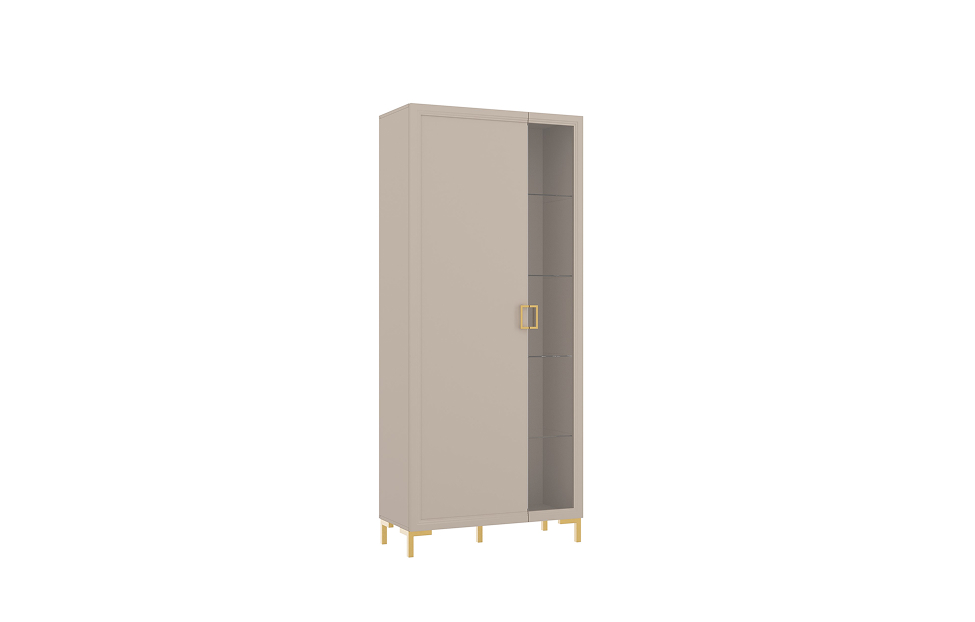 • Внутреннее наполнение: 4 стеклополки 6 мм за стеклянным фасадом, 1 полка ЛДСП 16 мм, и выдвижная штанга — за глухим;